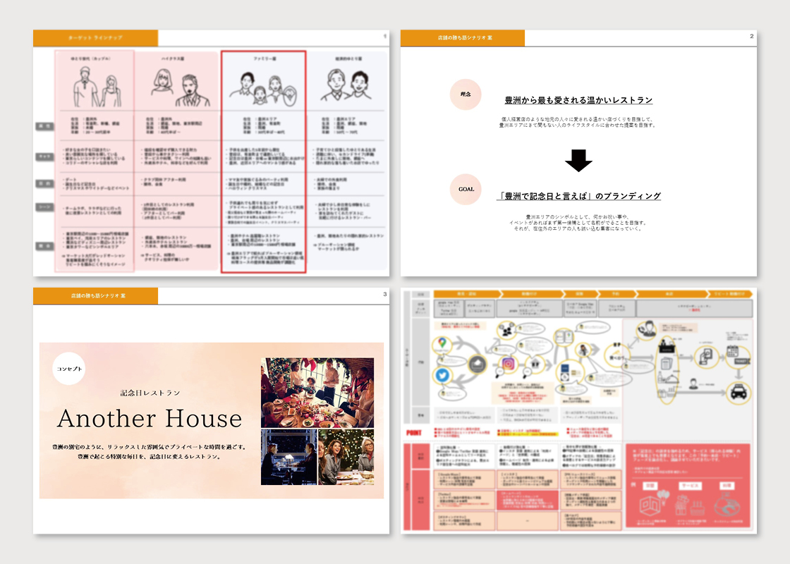 マーケット分析、ビジネスモデルの検討、ターゲット設定を基に、独自のポジションを確立するためのコンセプトを立案しました。そのコンセプトに基づいたコミュニケーション構想を通じて、集客戦略や施策を立案し、レストランのマーケティングを総合的に支援しました。